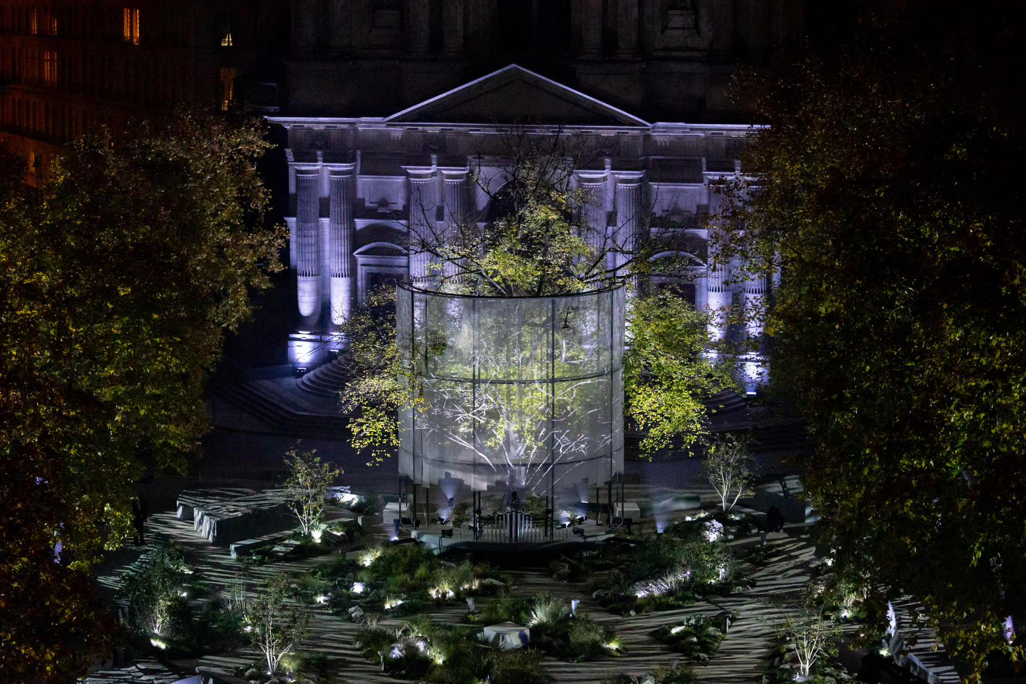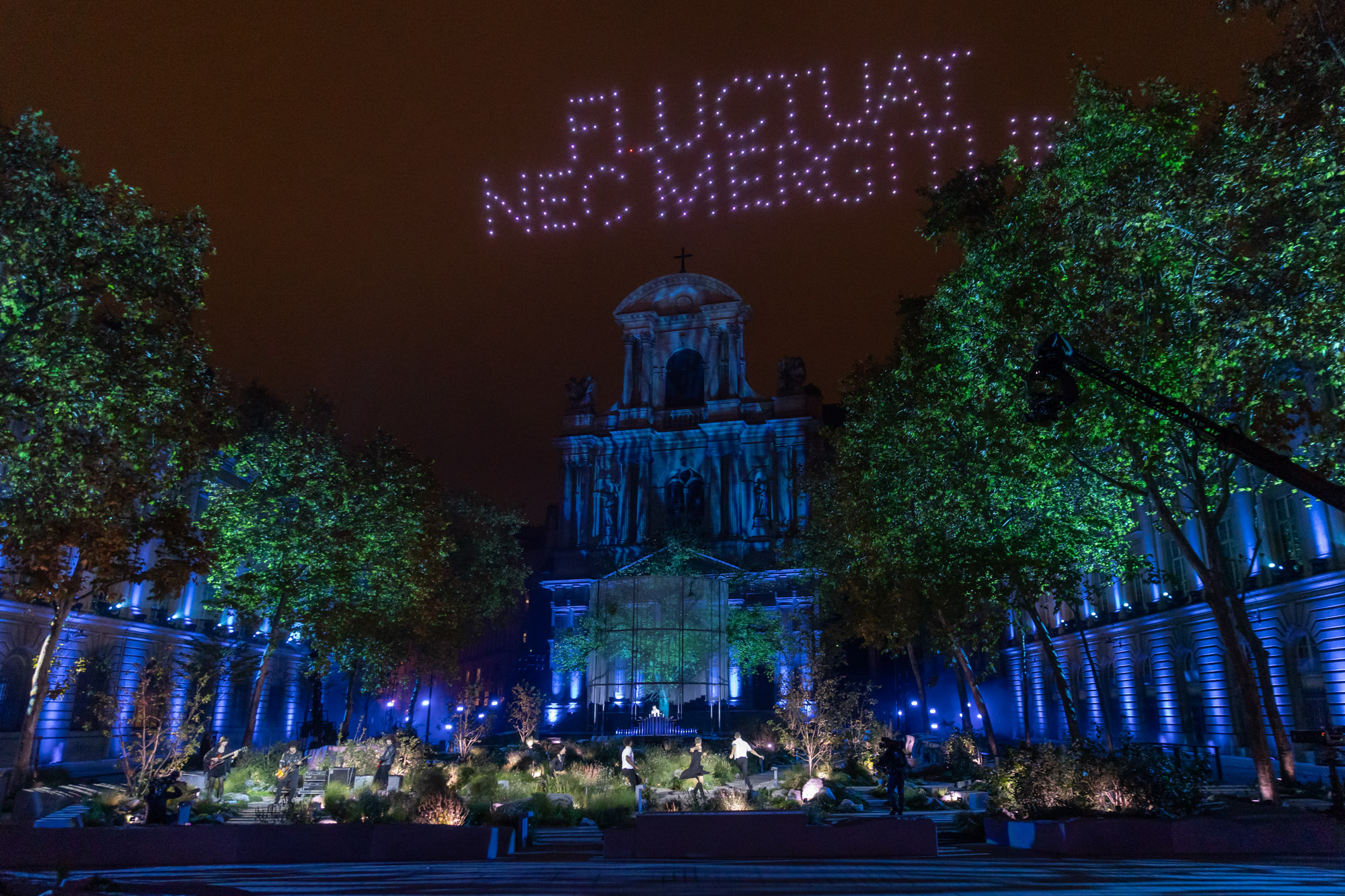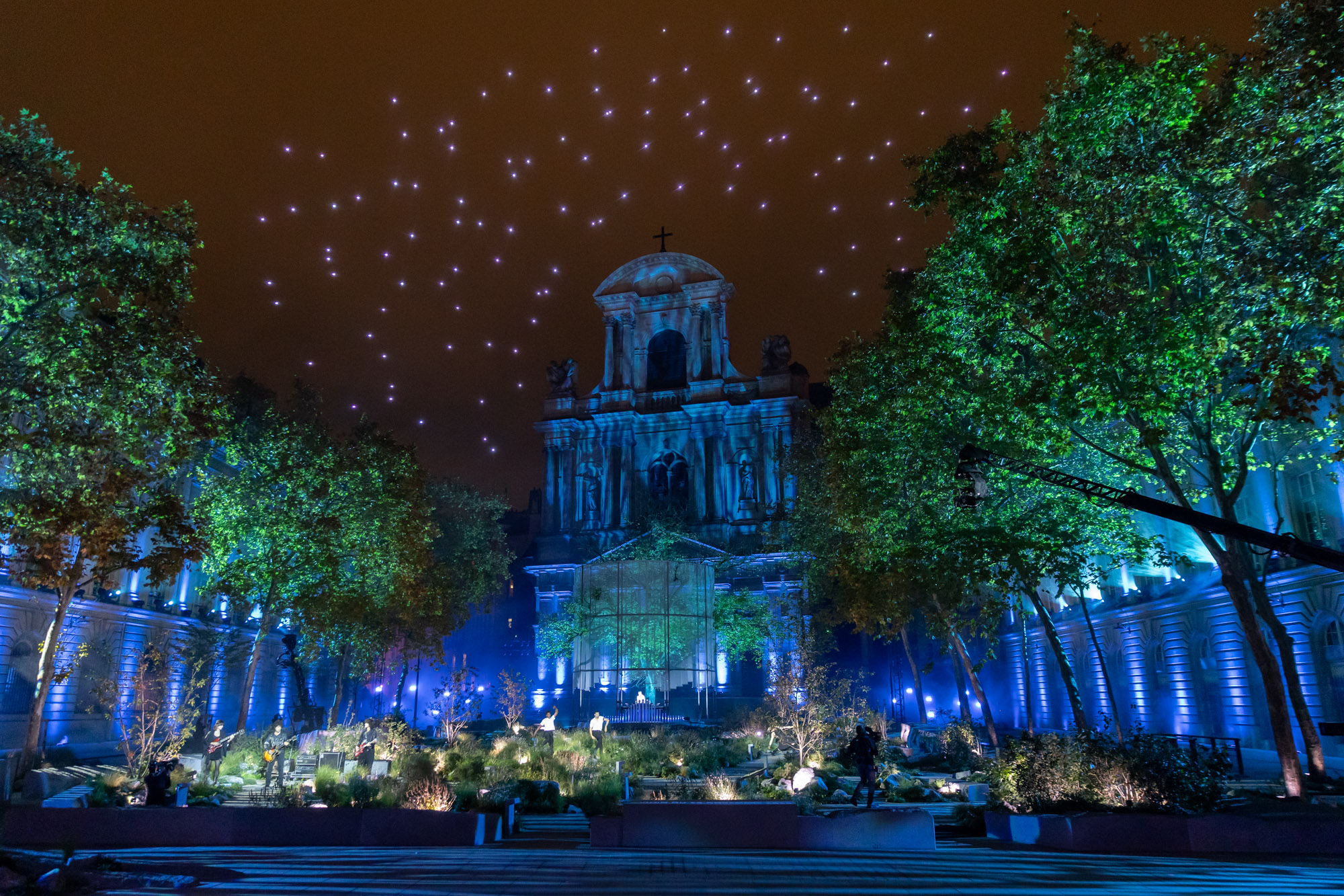 Les drones dessinent la devise de Paris, Fluctuat Nec Mergitur, dans le ciel, au-dessus du jardin mémoriel.