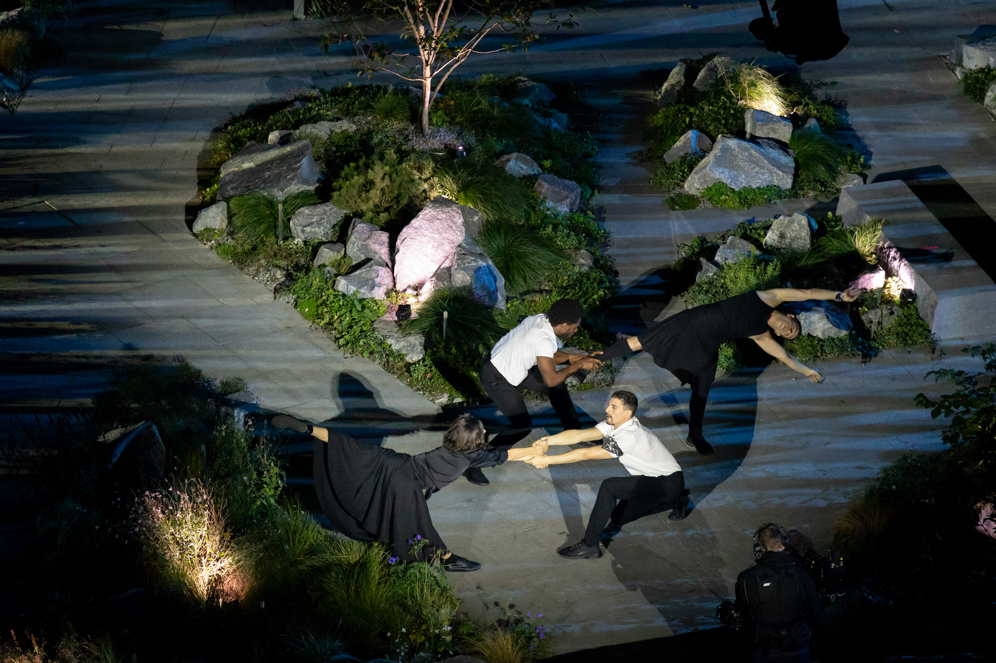 Pendant la prestation des guitaristes et des danseurs, 132 drones s'élevaient dans le ciel de Paris pour représenter les victimes.