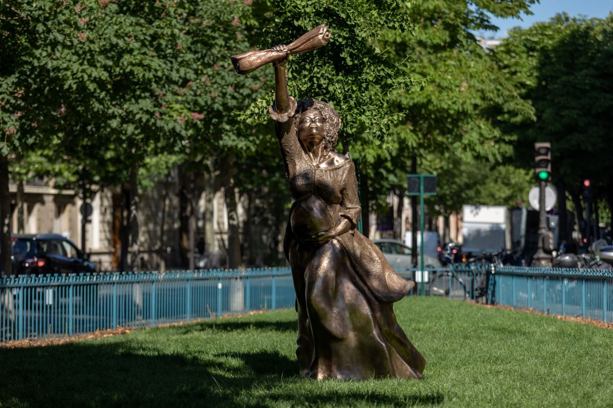 Les cheveux naturels et le ventre arrondi par la maternité, la représentation en bronze de Solitude brandit la proclamation de Louis Delgrès du 10 mai 1802. Elle est installée dans le 17e depuis 2022.