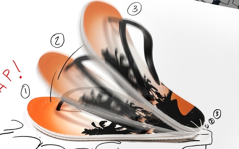 orchestre une installation sonore composée de 200 chaussures de plage.