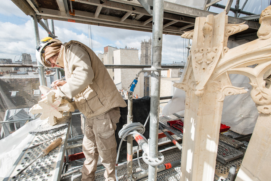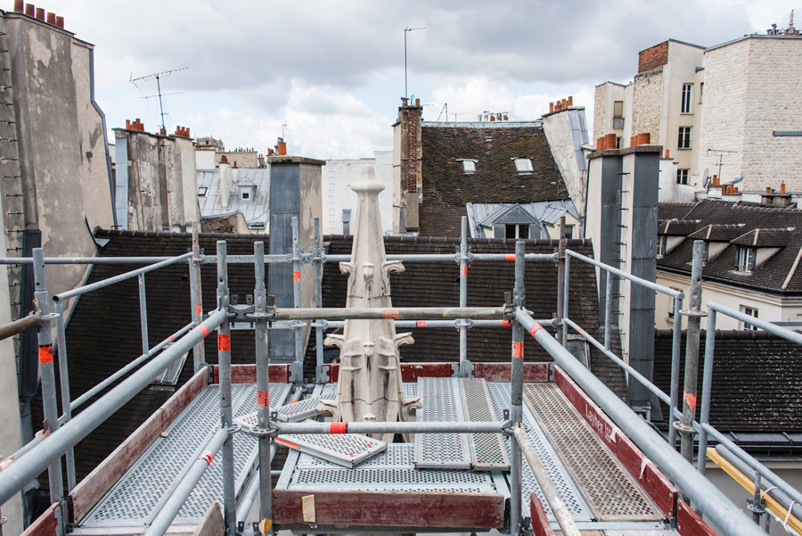 Les ouvriers sur les échafaudages de l'église Saint-Merry.