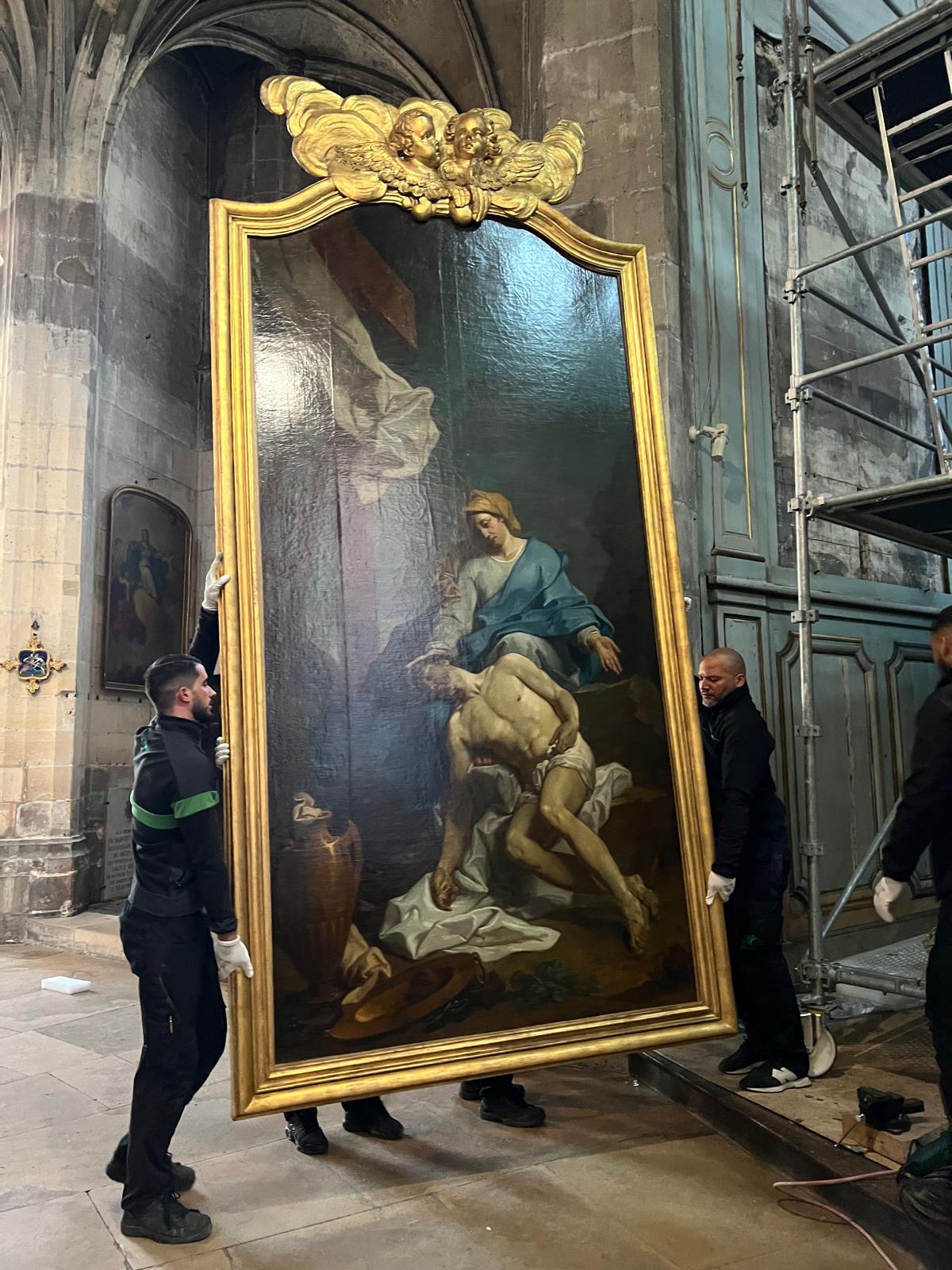 Accrochage du tableau restauré de "La Déposition de croix" de Collin de Vermont en 2025