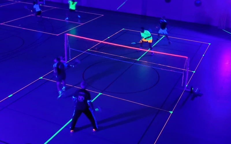 sportive propose de jouer en tenue fluo, avec de la musique sous une lumière