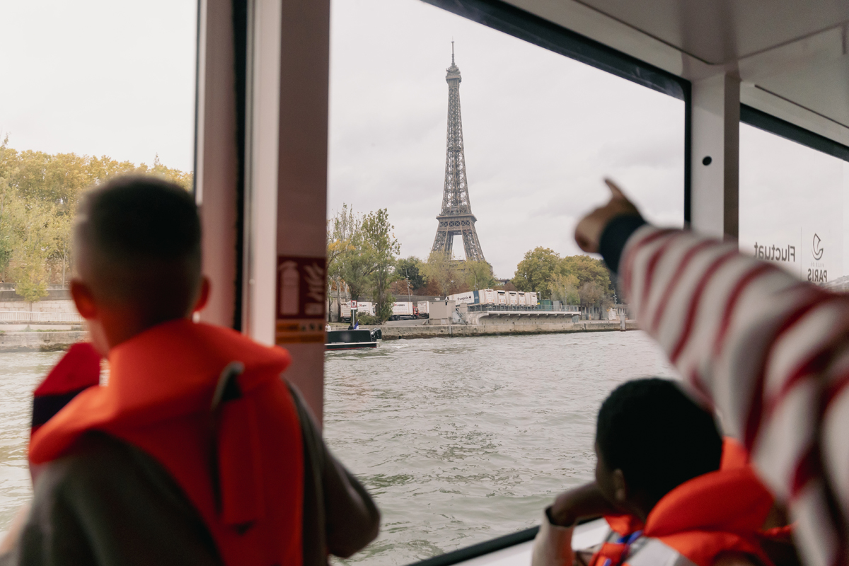 Vous pouvez raconter l’histoire la plus intéressante du monde aux enfants lors d’une croisière pédagogique : la tour Eiffel (7e) vous volera toujours la vedette ! Comme ici sur le « Fluctuat », bateau de la Ville de Paris.