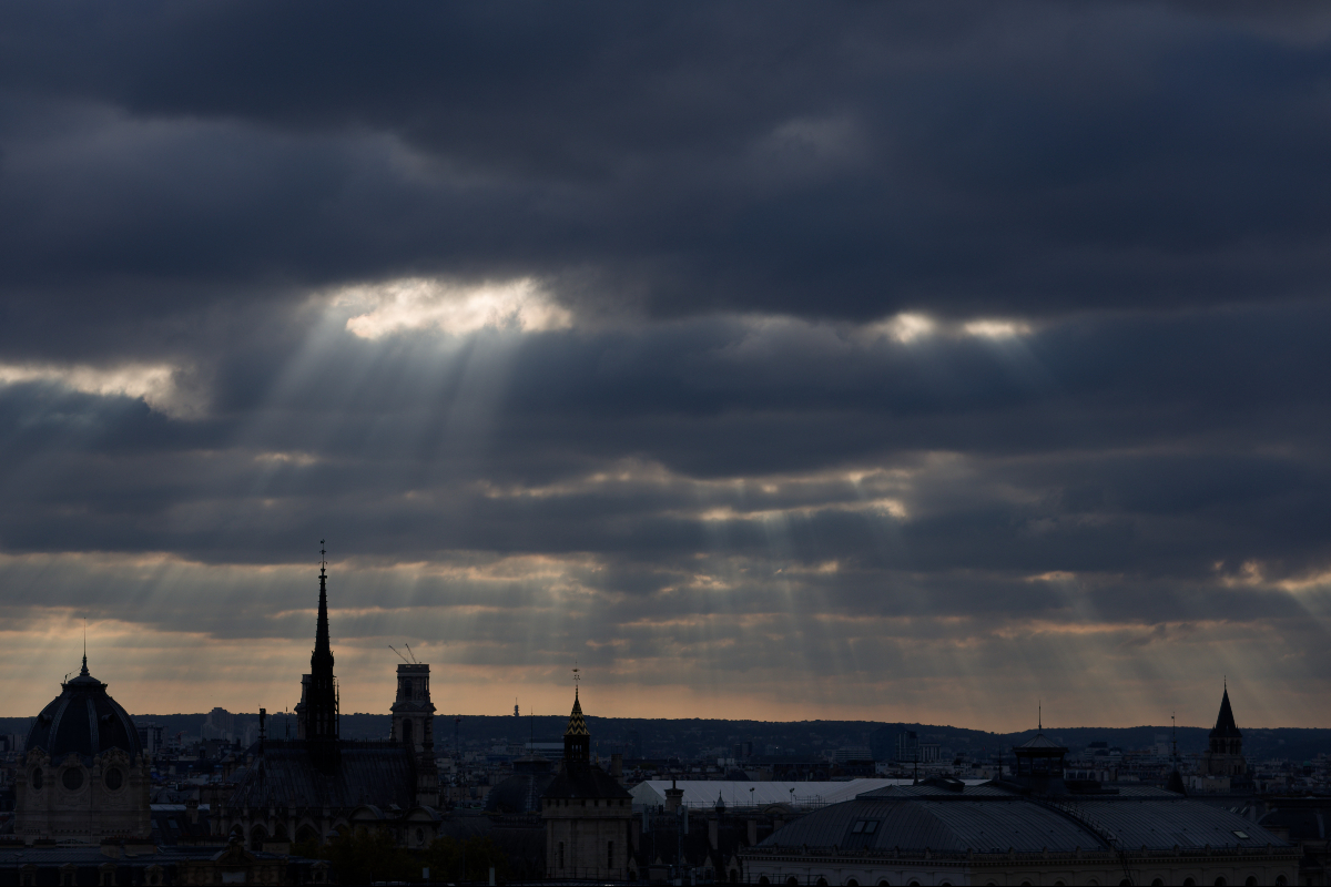 Depuis les tours de la cathédrale Notre-Dame (Paris Centre), on peut observer la capitale recouverte d’un soleil doré sous le regard de la Dame de fer.
