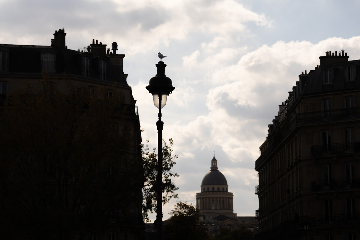 Une mouette rieuse jauge les passants, nichée sur un lampadaire, avec le Panthéon (5e) en toile de fond.