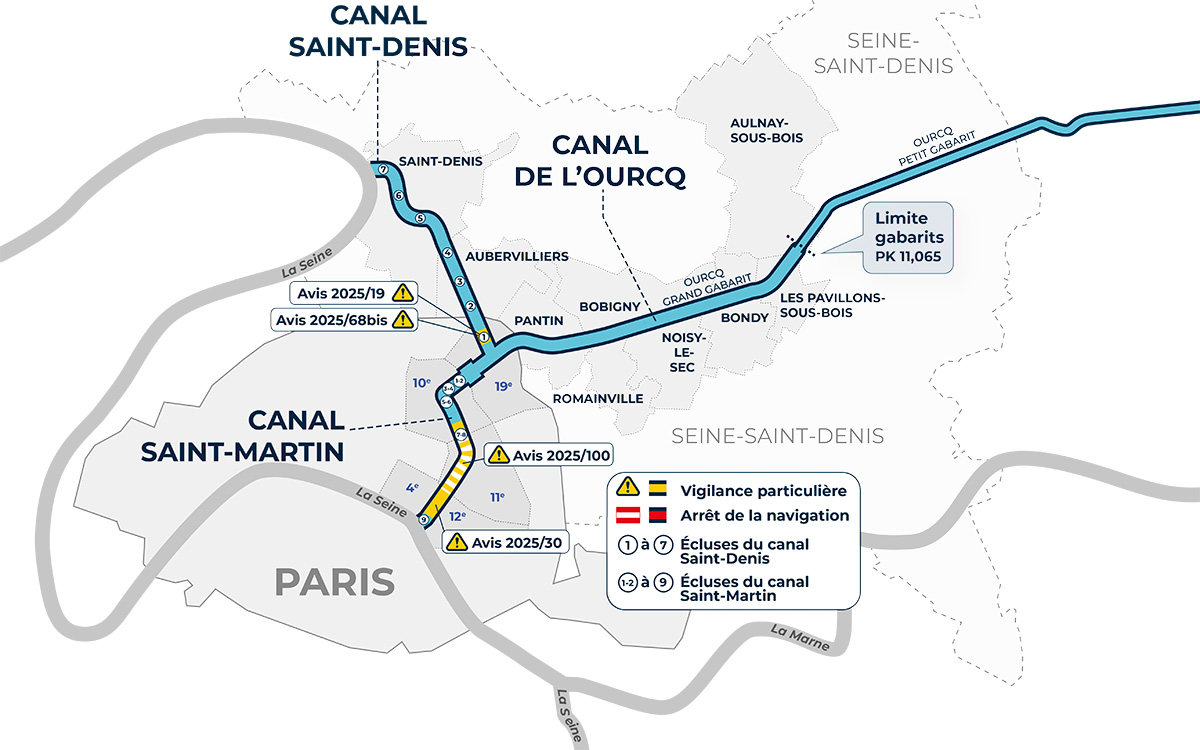 Les usagers du canal Saint-Martin sont informés de la reprise de la navigation dans les écluses des Récollets à partir du 29 septembre 2025. Cet avis annule et remplace l'avis à la batellerie n°2025/98.