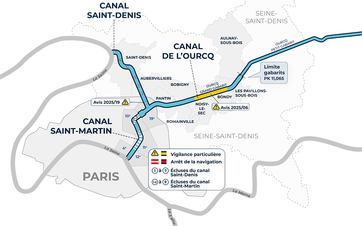 Les usagers du canal de l'Ourcq à petit gabarit sont informés de la présence importante de branches dans les portes amont de l'écluse de Vignely (77) empêchant la manœuvre de l'ouvrage. Aucun bateau ne peut franchir l'écluse à compter du mardi 17 février 2026, néanmoins la navigation reste ouverte en amont et en aval de l'écluse. Un prochain avis préviendra de la reprise de la navigation.